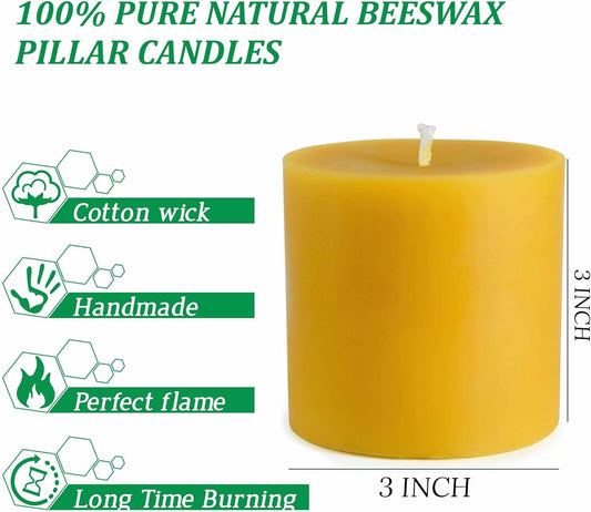 Pure Beeswax Pillar Candles – 2-Pack, 3x3", Unscented, Slow-Burning (110 hrs)